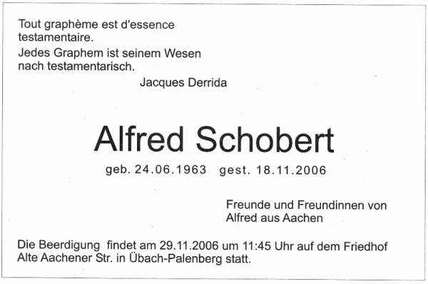 Wir dokumentieren Nachrufe auf Alfred Schobert, die an anderer Stelle und aus unterschiedlichen Perspektiven erschienen sind: Anzeige der Aachener Freundinnen und Freunde von Alfred