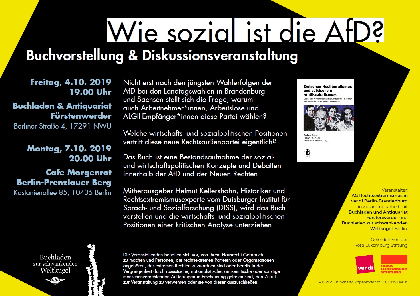 Nicht erst nach den jüngsten Wahlerfolgen der AfD bei den Landtagswahlen in Brandenburg und Sachsen stellt sich die Frage, warum auch Arbeitnehmer* innen, Arbeitslose und ALGII- Empfänger* innen diese Partei wählen? Welche wirtschafts- und sozialpolitischen Positionen vertritt diese neue Rechtsaußenpartei eigentlich? Das Buch ist eine Bestandsaufnahme der sozialund wirtschaftspolitischen Konzepte und Debatten innerhalb der AfD und der Neuen Rechten. Mitherausgeber Helmut Kellershohn, Historiker und Rechtsextremismusexperte vom Duisburger Institut für Sprach- und Sozialforschung (DISS), wird das Buch vorstellen und die wirtschafts- und sozialpolitischen Positionen einer kritischen Analyse unterziehen.