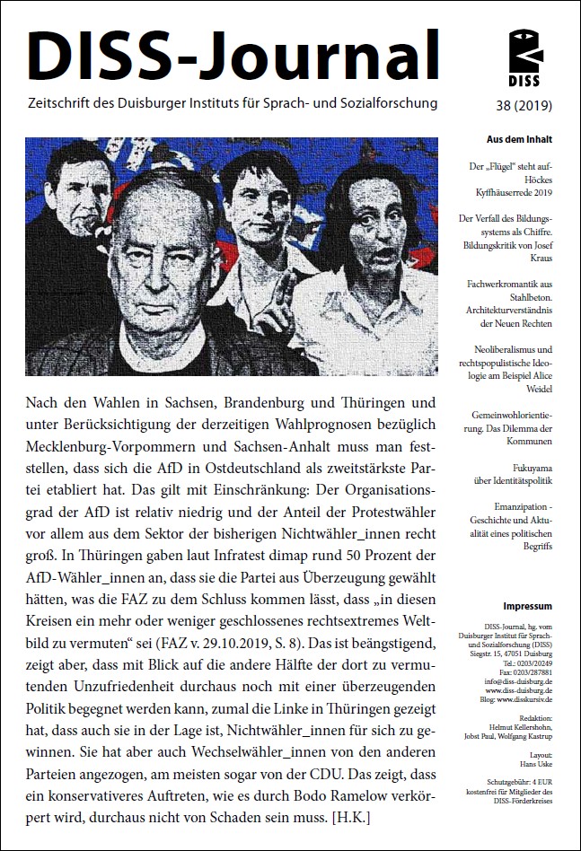 Nach den Wahlen in Sachsen, Brandenburg und Thüringen und unter Berücksichtigung der derzeitigen Wahlprognosen bezüglich Mecklenburg-Vorpommern und Sachsen-Anhalt muss man feststellen, dass sich die AfD in Ostdeutschland als zweitstärkste Partei etabliert hat. Das gilt mit Einschränkung: Der Organisationsgrad der AfD ist relativ niedrig und der Anteil der Protestwähler vor allem aus dem Sektor der bisherigen Nichtwähler_innen recht groß. In Thüringen gaben laut Infratest dimap rund 50 Prozent der AfD-Wähler_innen an, dass sie die Partei aus Überzeugung gewählt hätten, was die FAZ zu dem Schluss kommen lässt, dass „in diesen Kreisen ein mehr oder weniger geschlossenes rechtsextremes Weltbild zu vermuten“ sei (FAZ v. 29.10.2019, S. 8). Das ist beängstigend, zeigt aber, dass mit Blick auf die andere Hälfte der dort zu vermutenden Unzufriedenheit durchaus noch mit einer überzeugenden Politik begegnet werden kann, zumal die Linke in Thüringen gezeigt hat, dass auch sie in der Lage ist, Nichtwähler_innen für sich zu gewinnen. Sie hat aber auch Wechselwähler_innen von den anderen Parteien angezogen, am meisten sogar von der CDU. Das zeigt, dass ein konservativeres Auftreten, wie es durch Bodo Ramelow verkörpert wird, durchaus nicht von Schaden sein muss. [H.K.]