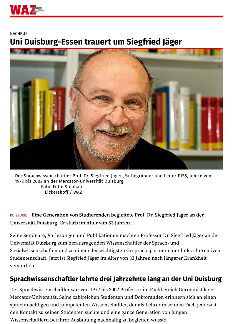 In der Lokalausgabe Duisburg der WAZ erschien ein Nachruf von Thomas Becker auf Prof. Dr. em. Siegfried Jäger.