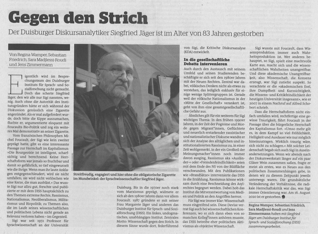 Nachruf von Regina Wamper, Sebastian Friedrich, Sara Madjlessi-Roudi und Jens Zimmermann auf Prof. Dr. em. Siegfried Jäger in der Zeitschrift analyse & kritik Nr. 663 vom 15. September 2020 (S. 5).