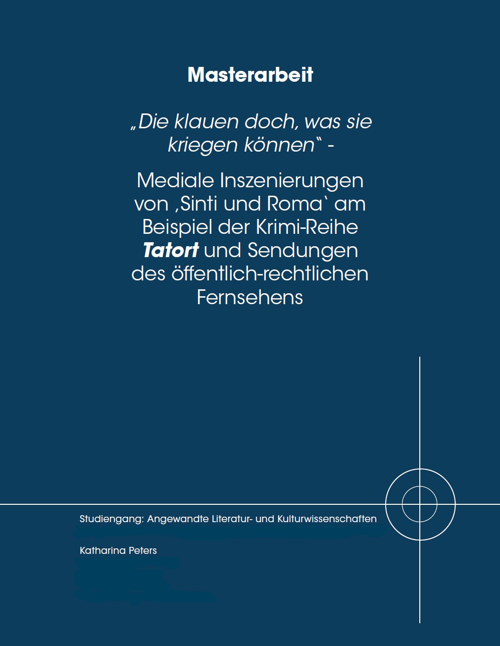 Katharina Peters hat in ihrer Abschlussarbeit mit Instrumenten der Diskurs- und Medienanalyse untersucht, welche Bilder von ‚Sinti und Roma‘ und als solche Gelesene im deutschen Fernsehen aufgegriffen und (re)produziert werden. Im Rahmen der Analyse werden diese in ihrer Konstruiertheit entlarvt und die folgenreichen Wechselwirkungen zwischen fiktionalen Sendungen wie dem Tatort und nicht-fiktionalen Formaten wie politischen Talkshows herausgestellt. Die Arbeit schafft dadurch Raum für andere Wirklichkeitsentwürfe und will die Sensibilität für eine diskriminierungsfreie mediale Darstellung schärfen.